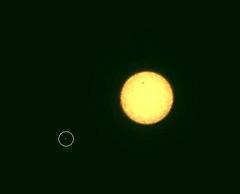 下写真は、金星が最も太陽中心に近い位置(太陽中心上方の黒い点)の時に撮影(再びデジカメ+偏光サングラス)したものです。写真左下の白丸の中には、偶然に木星も写っていました。