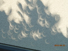 上写真は、日食の経過を自宅や会社で撮影(デジカメ+偏光サングラス)したものを編集したものです。中写真は、日食中の三日月状の木漏れ日です。