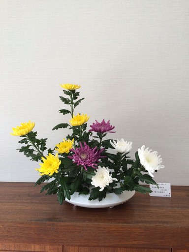 葉の眺めの美しさに気をつかい、三色の菊が縦横同じように並ばないようにするとGOOD!