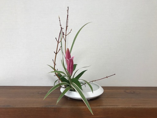 ** 4月の作品 **たてるかたち<花材> ・イタヤカエデ(カエデ科) ・キキョウラン[葉](ユリ科) ・ユリ(ユリ科) 今週のお花は「たてるかたち(応用)」です。とても大きいユリは中間枝として使い、中央でインパクトを!あとはキキョウランの葉で動きを出しました。