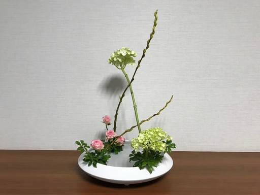 ** 12月の作品 **花奏[はなかなで]<花材> ・アカメヤナギ(ヤナギ科) ・アジサイ(アジサイ科) ・スプレーバラ(バラ科) ・アセビ(ツツジ科) 前回のお花がとても長くもったので久しぶりのアップになります。今週のお花は「花奏(はなかなで)」です。この時期にアジサイって感じですですが、淡いグリーンが可愛いので入れてみました。