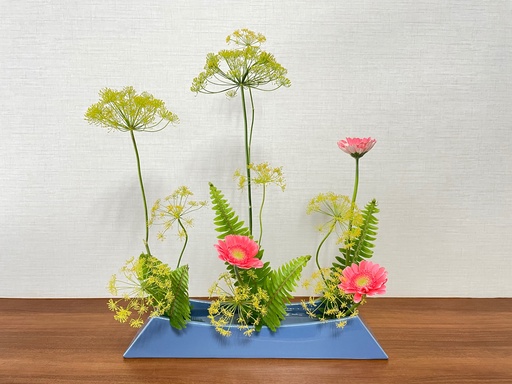 4月になり、ちょっと風が強いですが、だんだんと春らしい陽気になってきました。ちょうど桜も満開でとても綺麗です。今週のお花は「ならぶかたち」です。主材の黄色いお花「ウイキョウ」と言います。漢字では「茴香」と書き、セリ科の仲間なので結構独特な香りがします。タマシダだけでは剣山が見えてしまうので下のほうにも短くウイキョウを入れ華やかにします。ピンクのガーベラとの色合いがバッチリ!