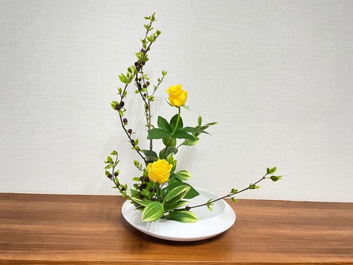 今週のお花は『たてるかたち』です。主材のクロロウバイは香木で葉や花を触ると良い香りがします。多数の花弁からなるチョコレート色のお花が特徴です。耐寒性と耐熱性に優れているので庭木や鉢植えでもよさそうです。