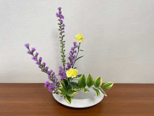 今週のお花は直立型です。主材の紫色と中間枝のカーネーションの色合いが可愛いいお花です。客枝にナルコユリを入れて足元を締めました。