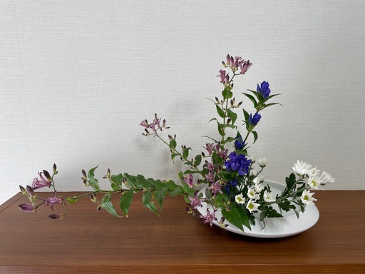 今週のお花は「傾斜型」です。主材のホトトギスは花弁の斑点が鳥のホトトギスの胸の模様に似ていることから名づけられました。花は星の形で、特徴的な斑点が入ります。あまりたくさん花をつけるわけではありませんが楚々とした風情があるお花です。秋らしいお花になりました。
