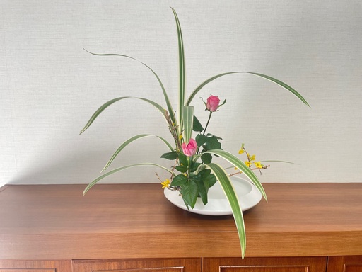 今週のお花は「たてるかたち」です。今回はキキョウランを主材としてに入れましたが、黄色の花のレンギョウを主材にする事も出来ます。私はスラリとしたキキョウランの葉を活かしたいと思いました。レンギョウを主材にすると黄色の花が際立って華やかなお花になります。生け手の感覚でお花はいろいろな表情になります。