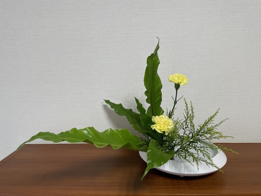今週のお花は「傾斜型」です。主材のタニワタリは真っ直ぐでしっかりとした葉を長く、細い葉や曲がった葉は短く使うと入れやすくなります。足元はソリダコを使い剣山が見えないようにすると綺麗なお花になります。