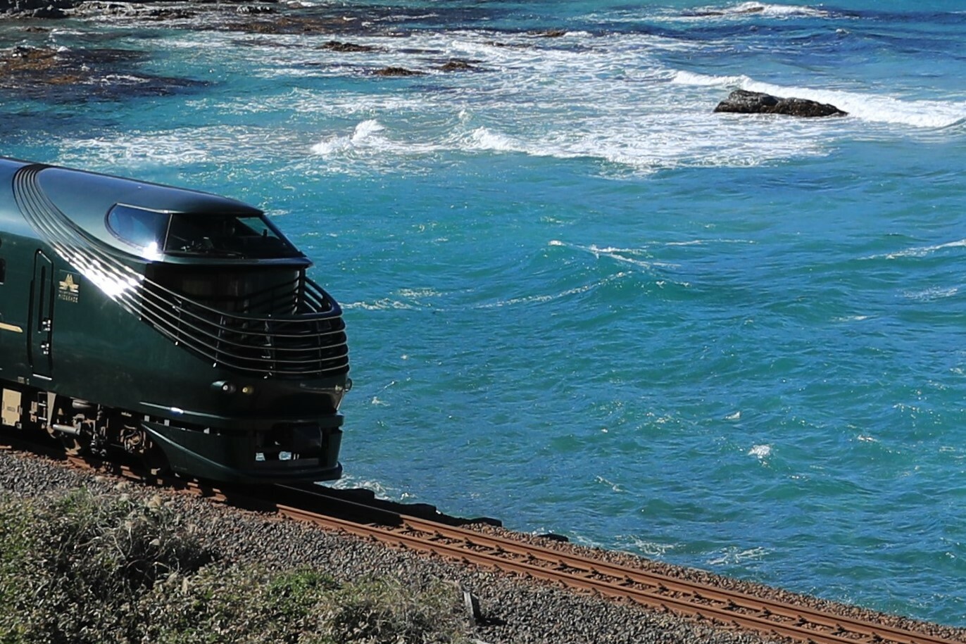 青い海を走る瑞風(1) 2023/09/19 [クリックで拡大(0.4 MB)]秋空と青い海の間を走る瑞風を写しました。1撮影場所:道の駅 三隅撮影日時:令和4年(2022)10月31日 午後1時30分過ぎ