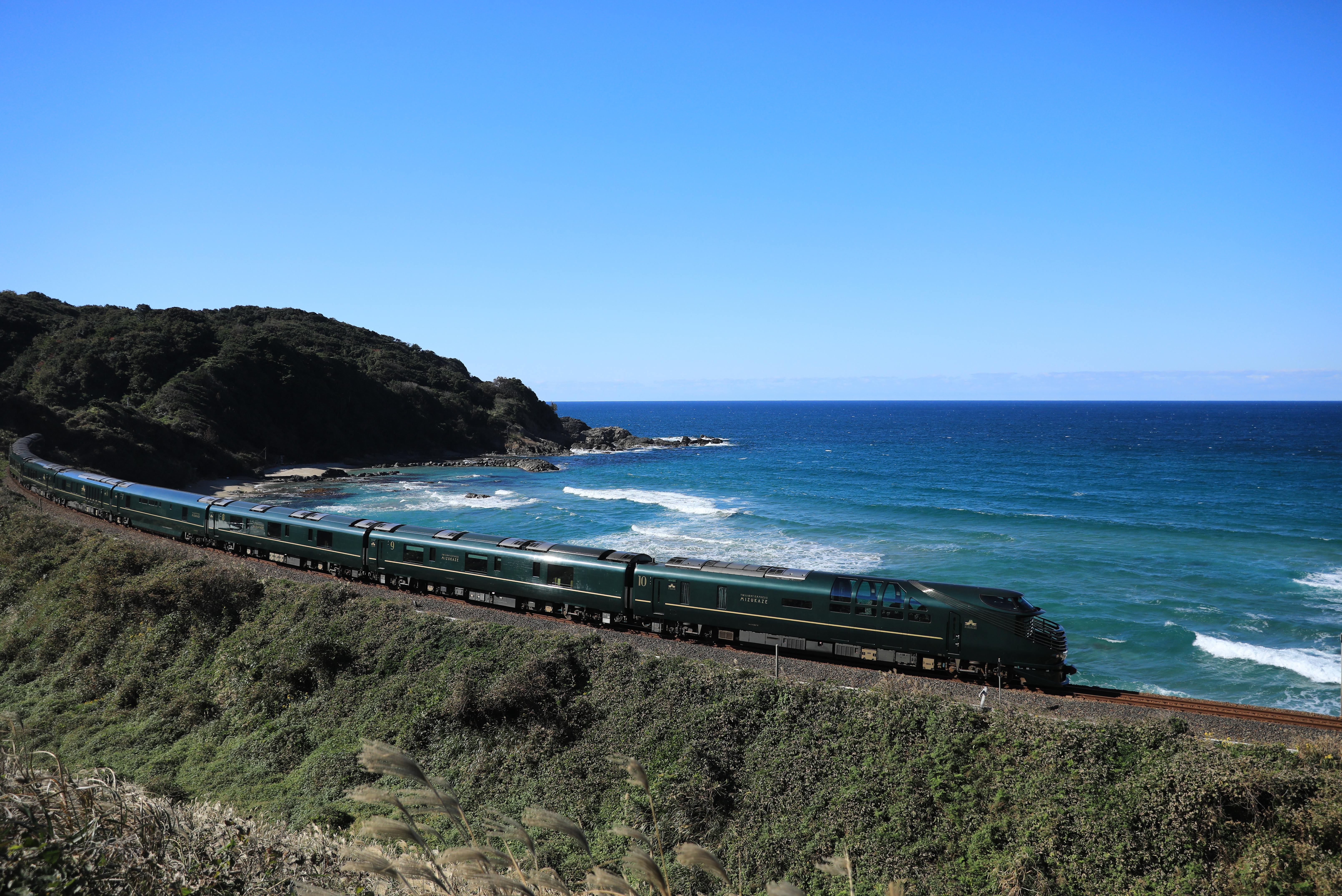 青い海を走る瑞風(2) 2023/09/25 [クリックで拡大(17.5 MB)]秋空と青い海の間を走る瑞風を写しました。1撮影場所:道の駅 三隅撮影日時:令和4年(2022)10月31日 午後1時30分過ぎ
