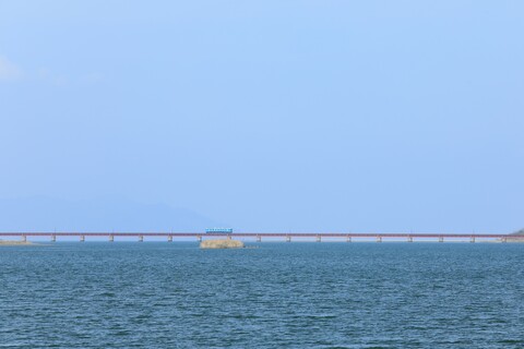 青い空と河口を走る列車を写しました。