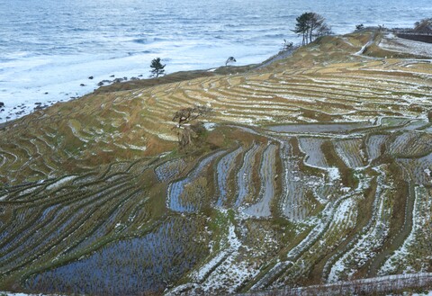 コメント :日本海から強風のなか新雪の白米千枚田を写しました。